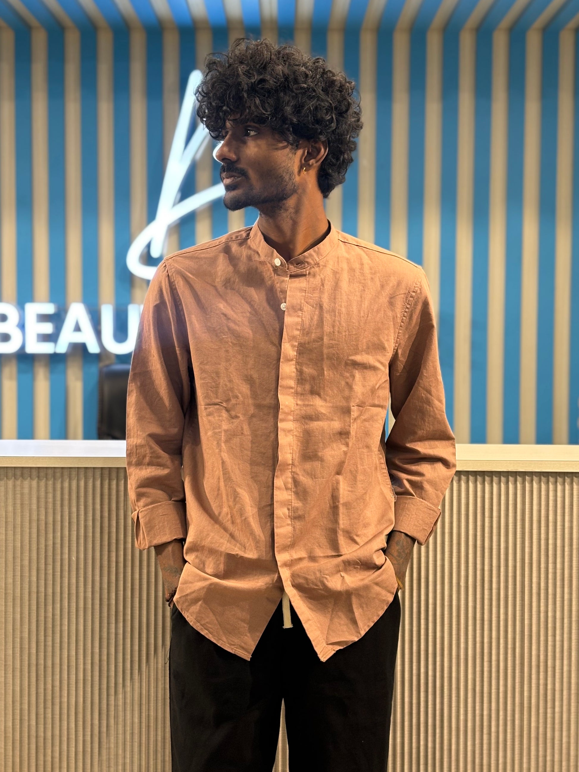 Give your everyday wardrobe an effortless appeal with this classy 100% cotton linen shirt. Designed in a slim fit, this shirt is known for its endless versatility. A look that bridges dressy and casual, with full sleeve and Mandarin, it is perfect to wear alone or as an outer layer.
