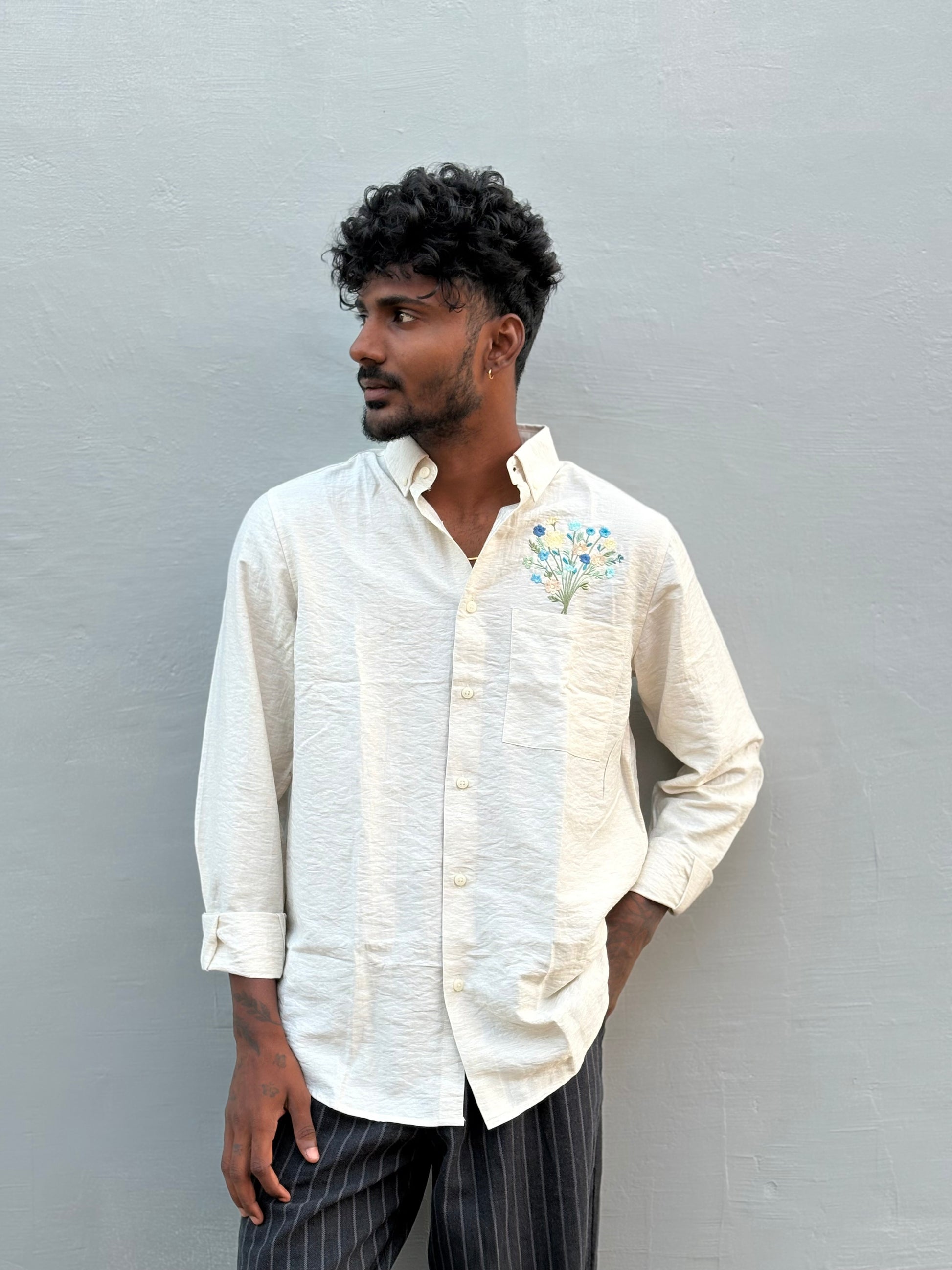 Off White Linen Blended Embroidery Shirt