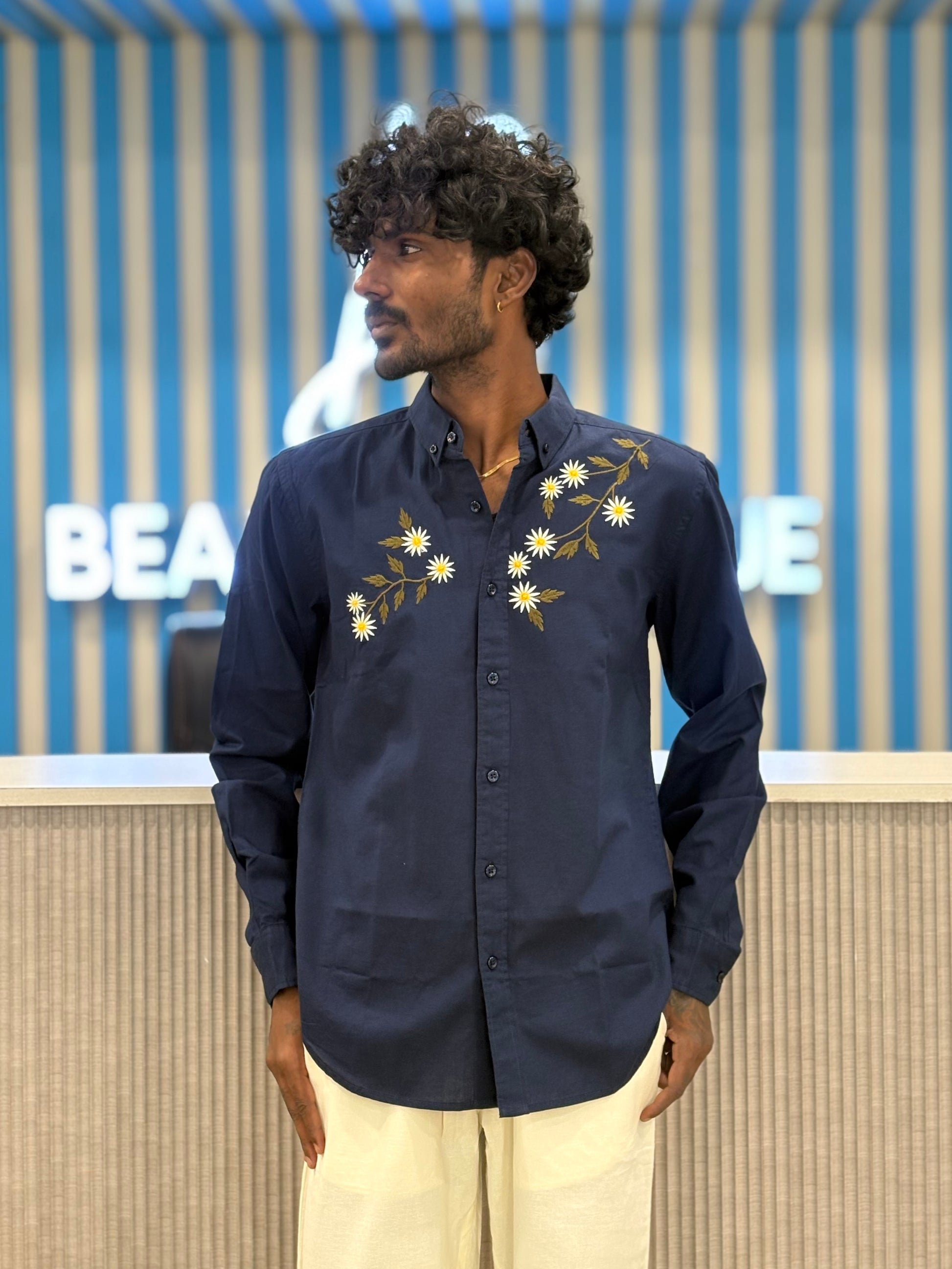 Navy Blue Linen Embroidery Shirt